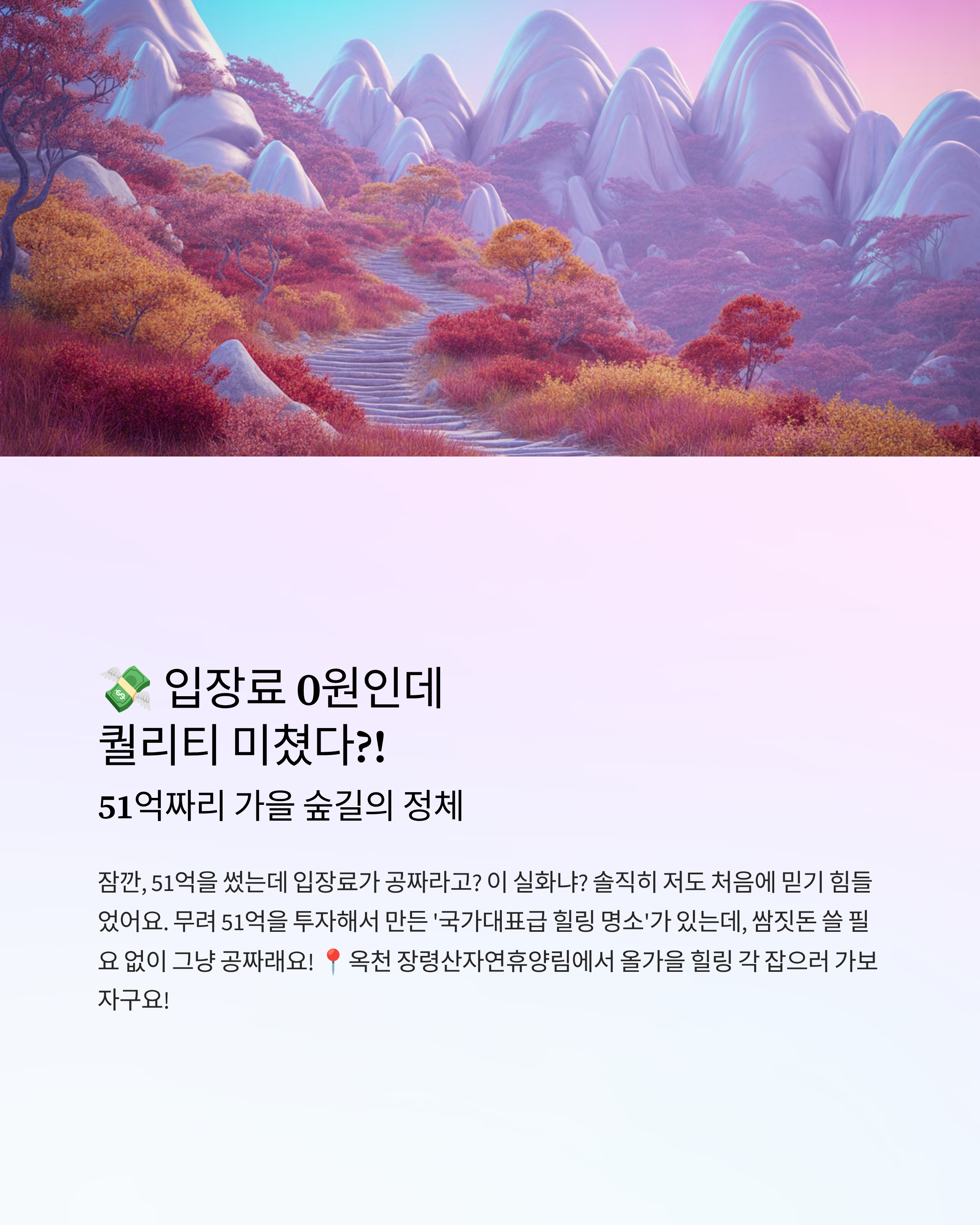 🤷♀️ 잠깐, 51억을 썼는데 입장료가 공짜라고? 이 실화냐?솔직히 저도 처음에 믿기 힘들었어요. 무려 51억을 투자해서 만든 '국가대표급 힐링 명소'가 있는데, 쌈짓돈 쓸 필요 없이 그냥 공짜래!가을 단풍 구경 어디 갈지 고민할 시간에 여기부터 찍으세요. 지갑은 가볍게, 힐링은 핵무겁게 채우고 올 수 있거든요. 여기 놓치면 올해 가을 후회함! 🙅♀️🏞️ 미친 퀄리티 인증! 장령산 휴양림에서 꼭 해야 할 것 4가지1. 🏃♀️ 3.1km짜리 명품 숲길, 피톤치드 코로 마시기이게 바로 51억의 위엄! 3.1km 내내 코스가 예술이에요.소원길 전망대에서 맑은 금천계곡이랑 오색 단풍 뷰 한 번 봐주면, 도시에서 쌓인 스트레스? 👋 잘 가!2. 🥶 폐광 동굴에서 펼쳐지는 8가지 테마 구경숲속에 뜬..