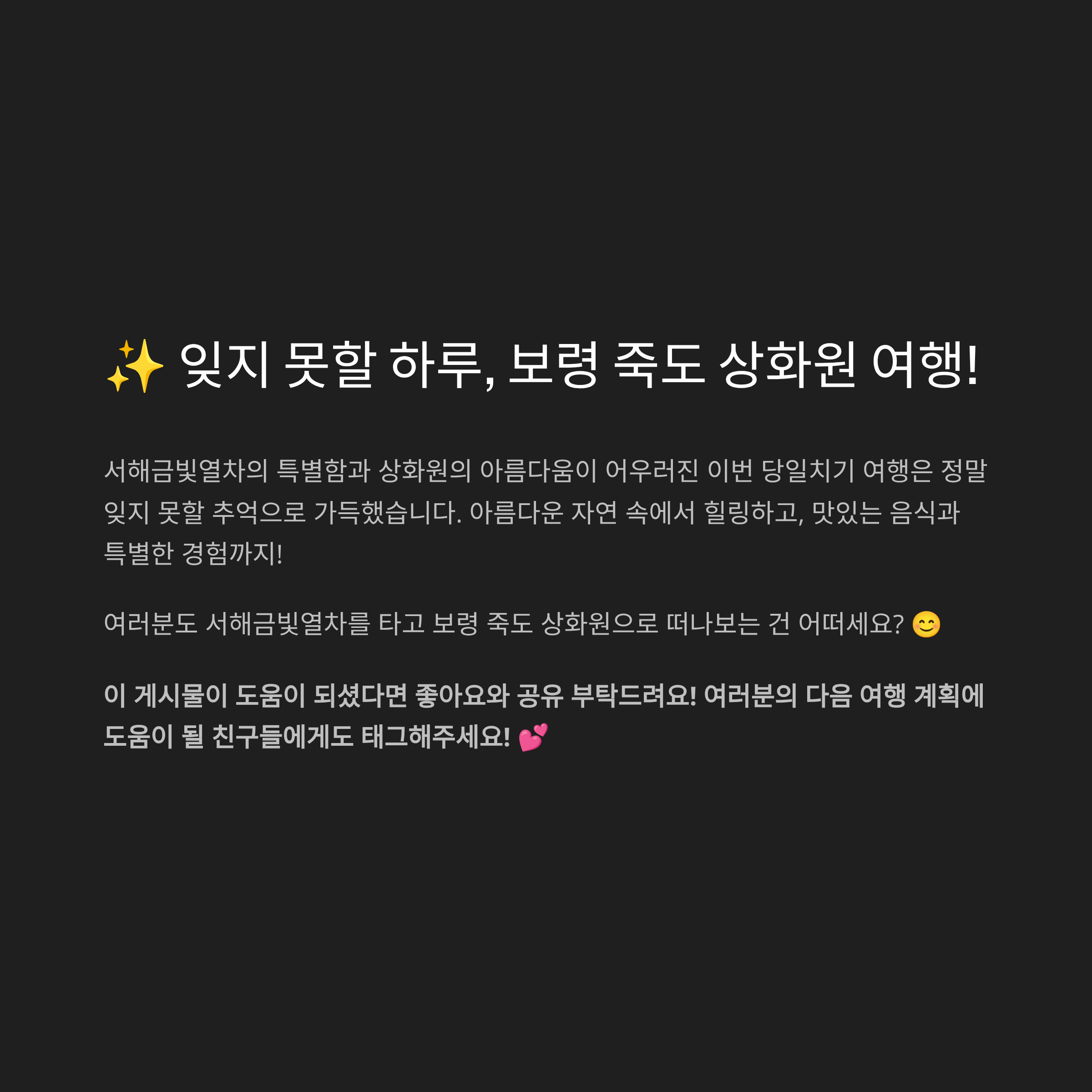여러분도 서해금빛열차를 타고 보령 죽도 상화원으로 떠나보는 건 어떠세요? 😊