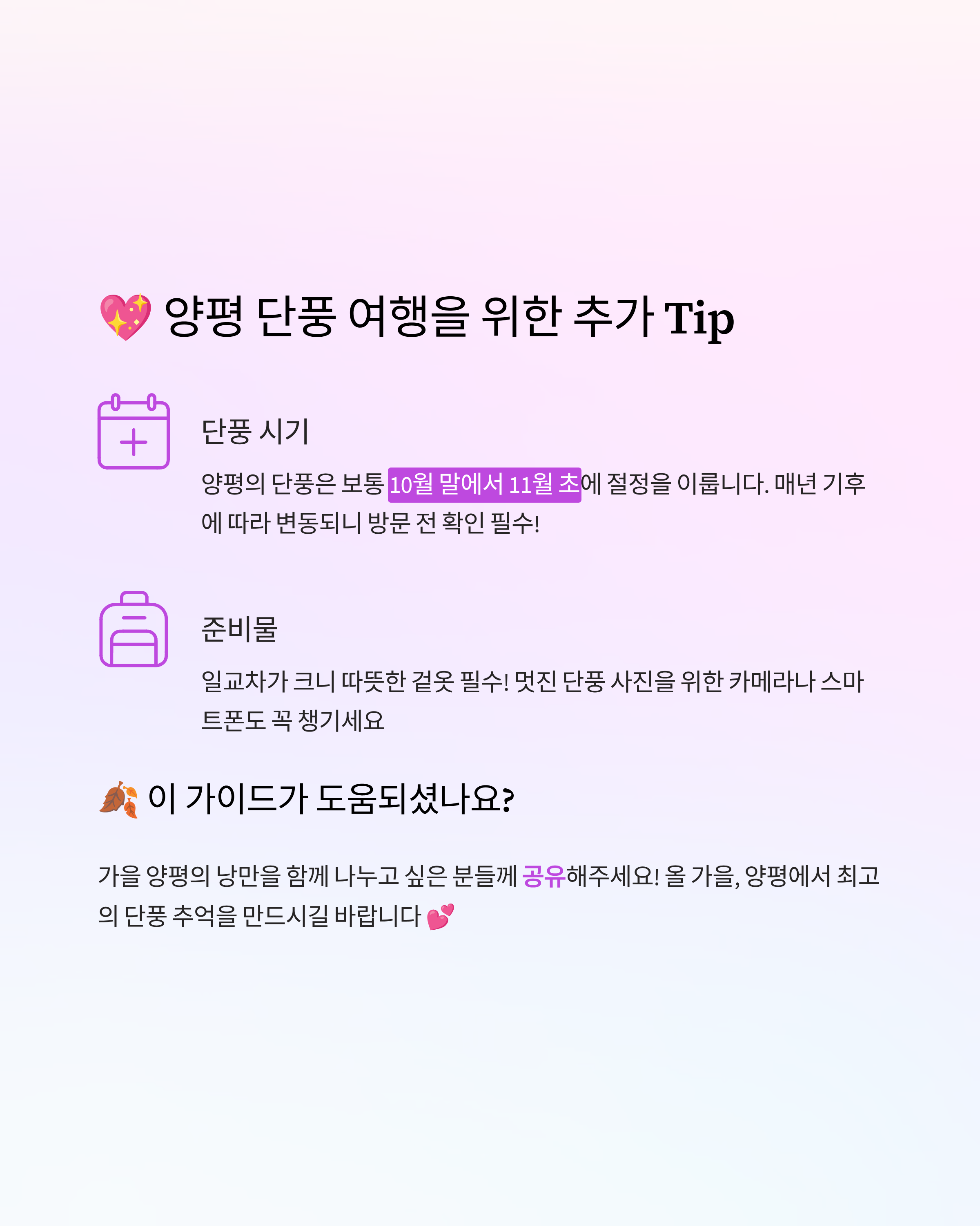 • 단풍 시기: 양평의 단풍은 보통 10월 말에서 11월 초에 절정을 이룹니다. (매년 기후에 따라 변동되니 방문 전 확인 필수!)