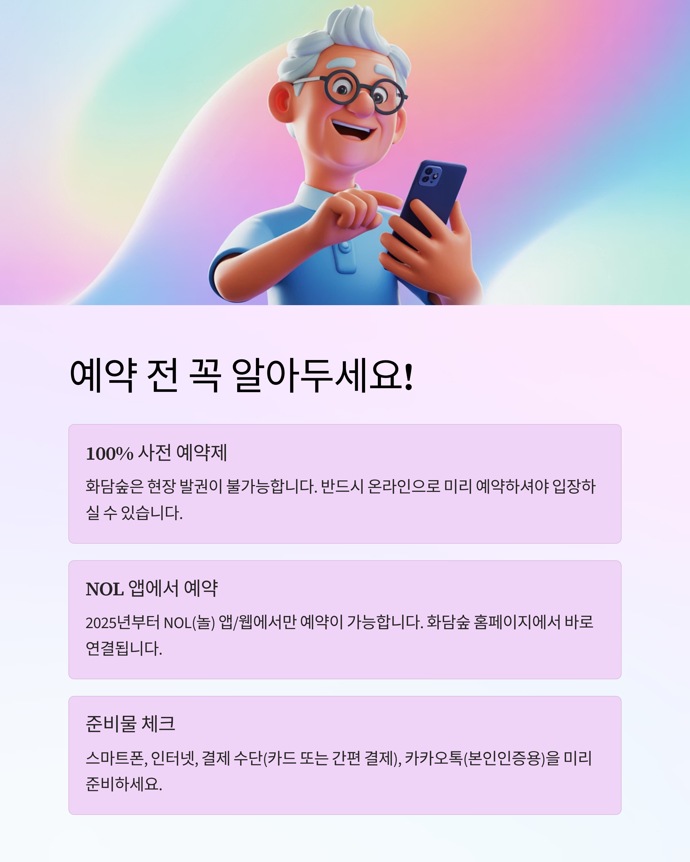• 예약 플랫폼: 화담숲 공식 홈페이지를 통해 'NOL(놀)' 앱 또는 웹으로 이동하여 예약이 진행됩니다. (2025년부터 NOL에서 단독 판매)