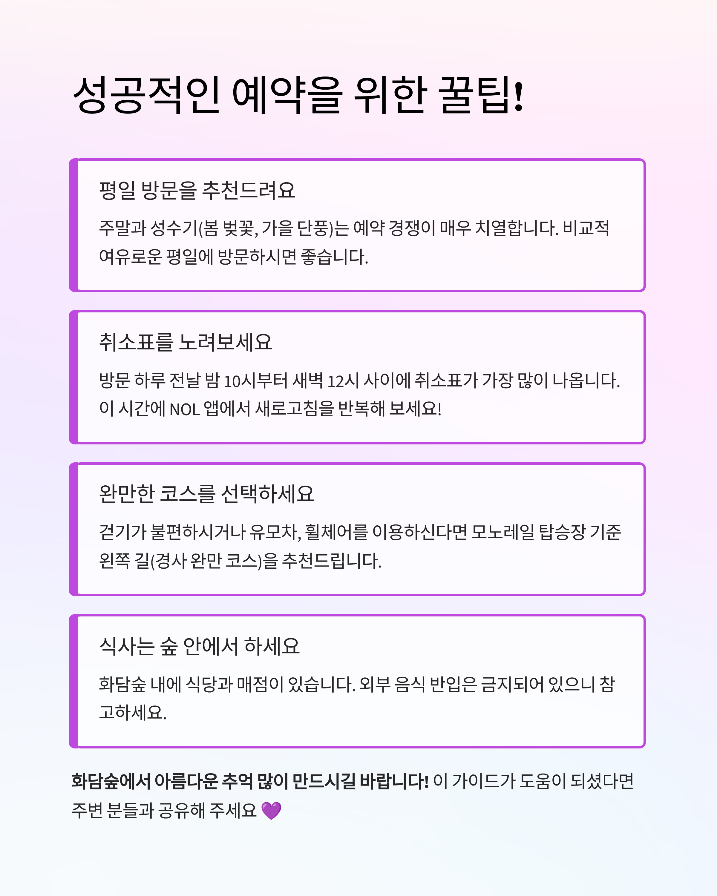 • 주의! 인기 시즌(봄 벚꽃, 가을 단풍) 주말은 경쟁이 치열하여 원하는 시간대가 빨리 마감될 수 있습니다. 평일 방문을 고려해 보세요!