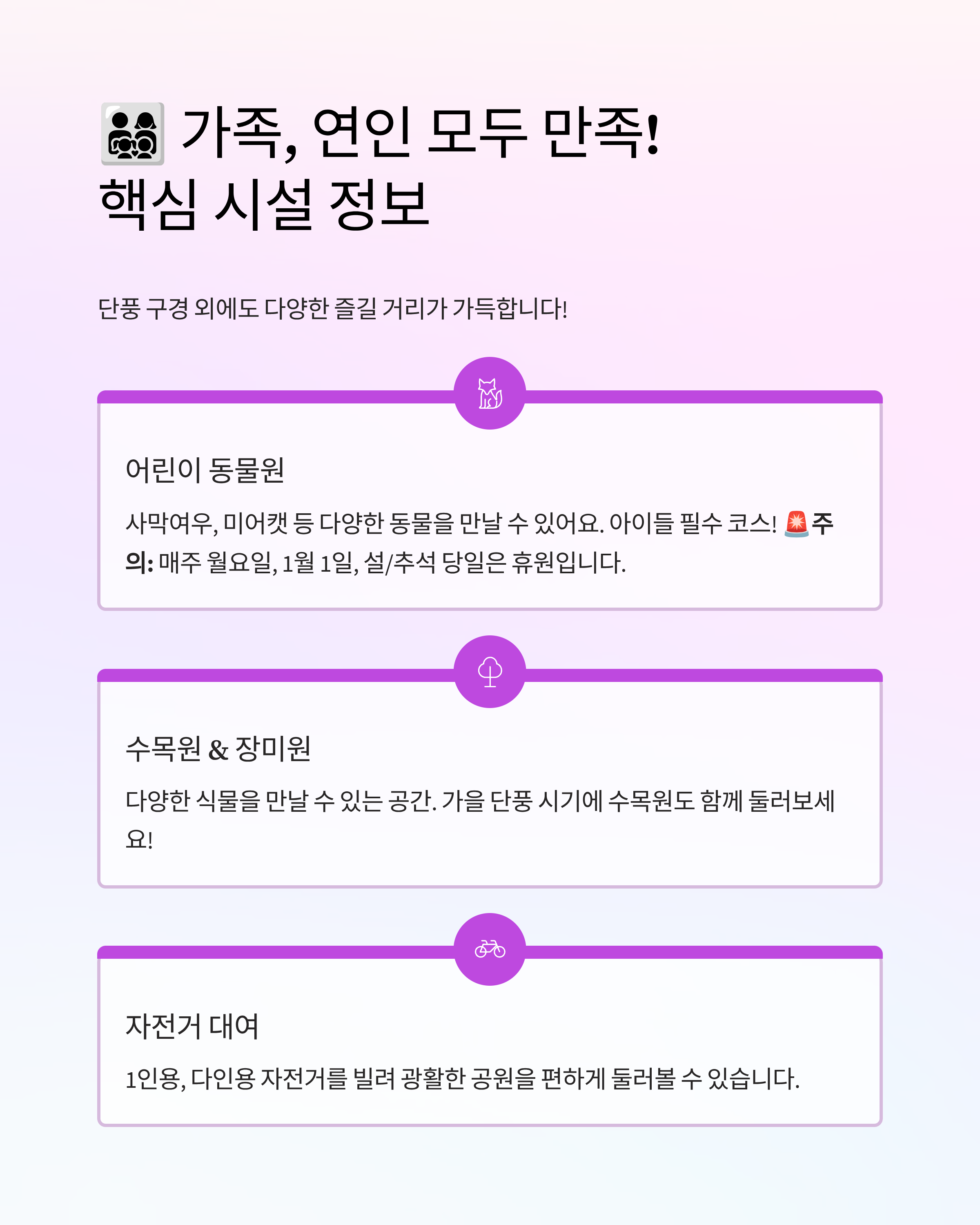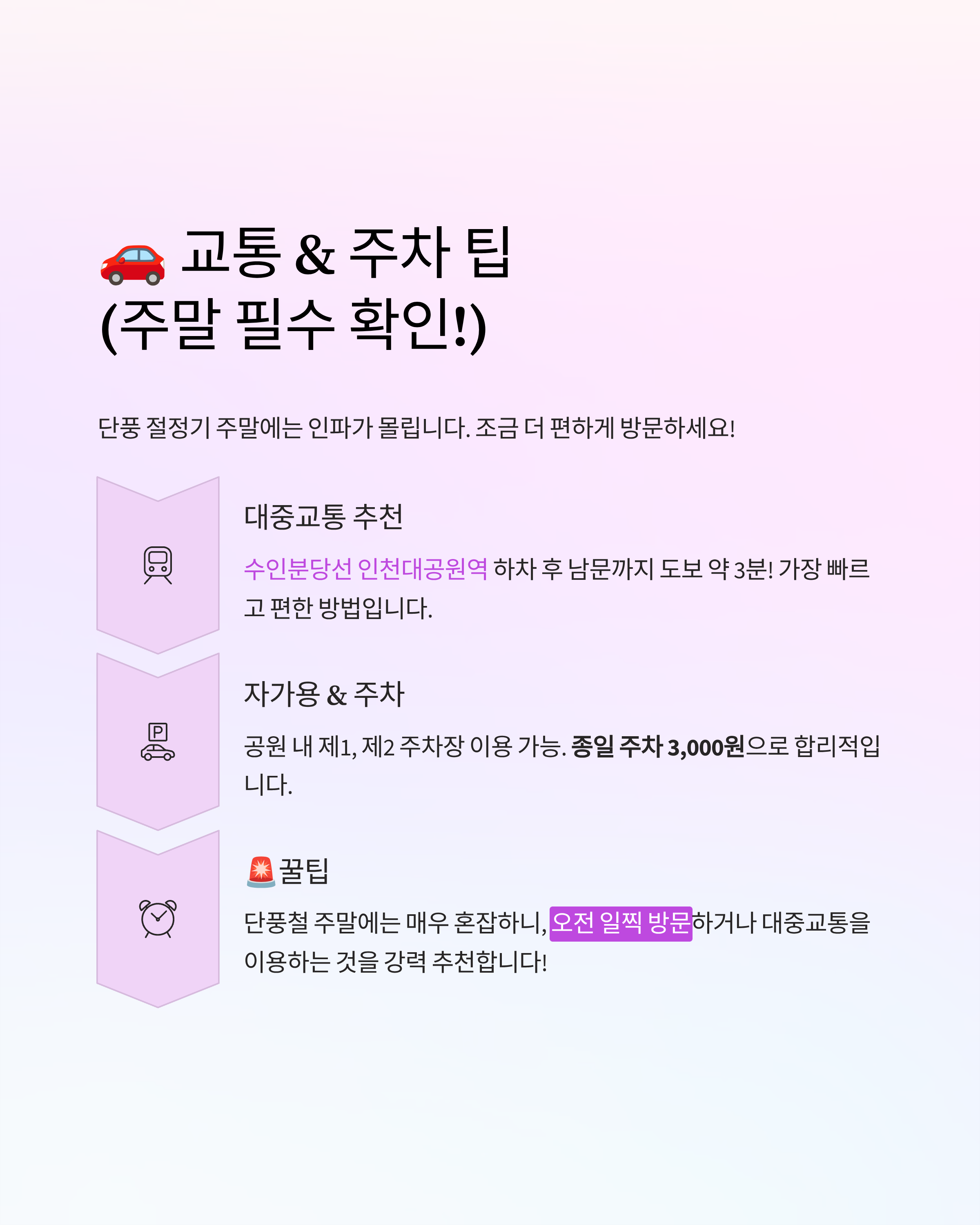 - 🚨꿀팁: 단풍철 주말에는 매우 혼잡하니, 오전 일찍 방문하거나 대중교통을 이용하는 것을 강력 추천합니다!