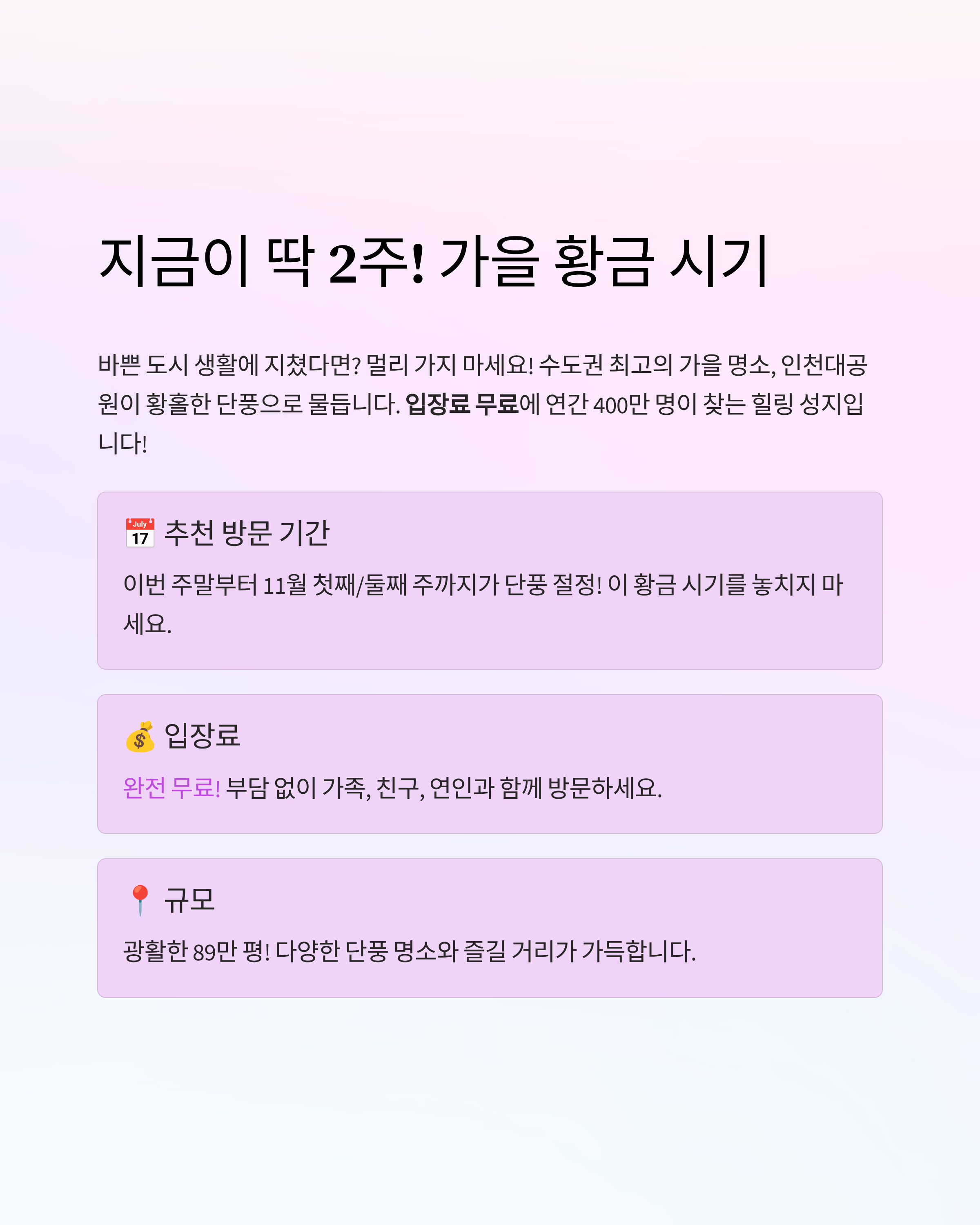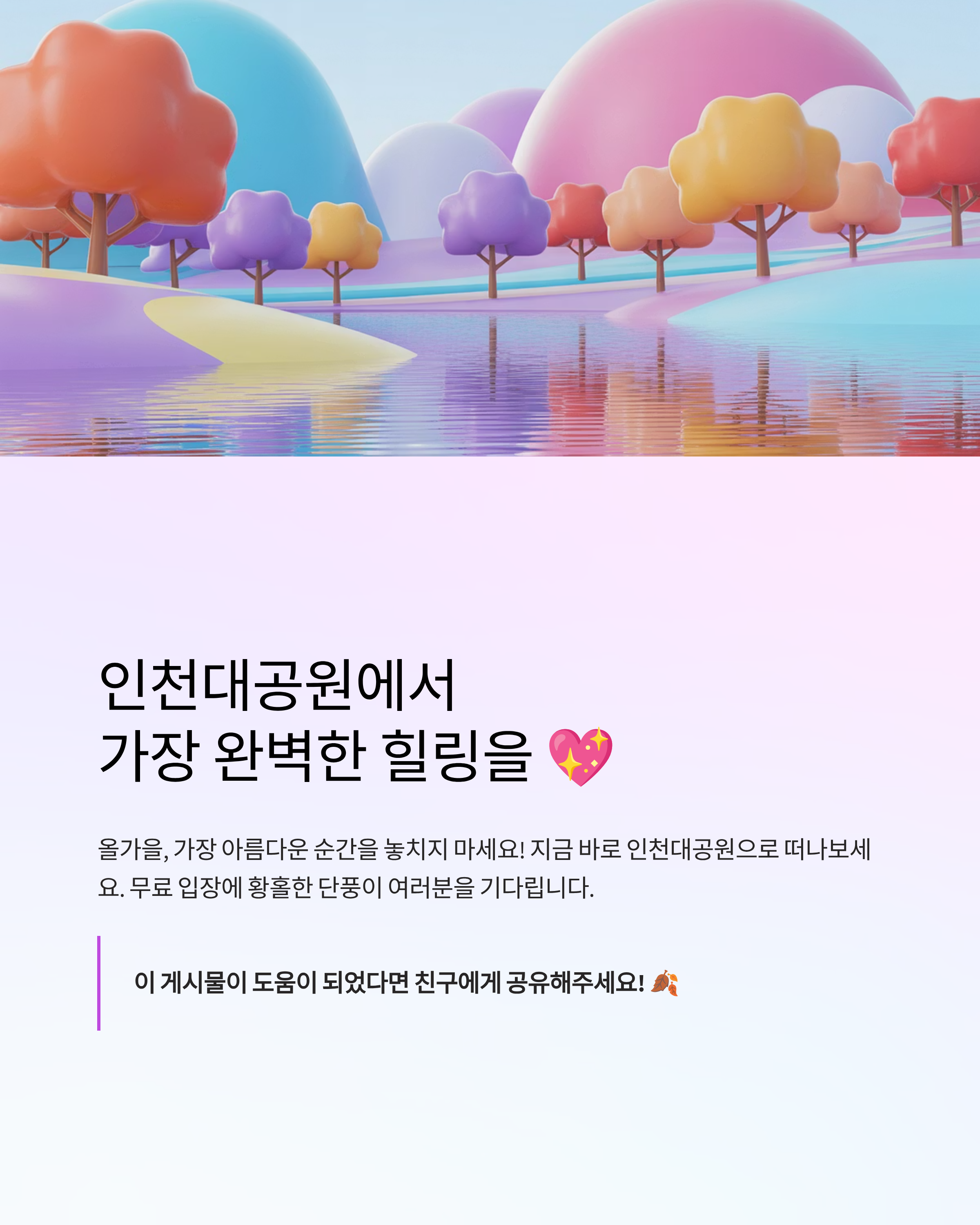 멀리 가지 마세요. 수도권 최고의 가을 명소, 인천대공원이 10월 말부터 11월 초까지 황홀한 단풍으로 물듭니다! 심지어 입장료는 무료! 연간 400만 명이 찾는 이 가을 힐링 성지를 모바일에서 빠르게 정복하세요!