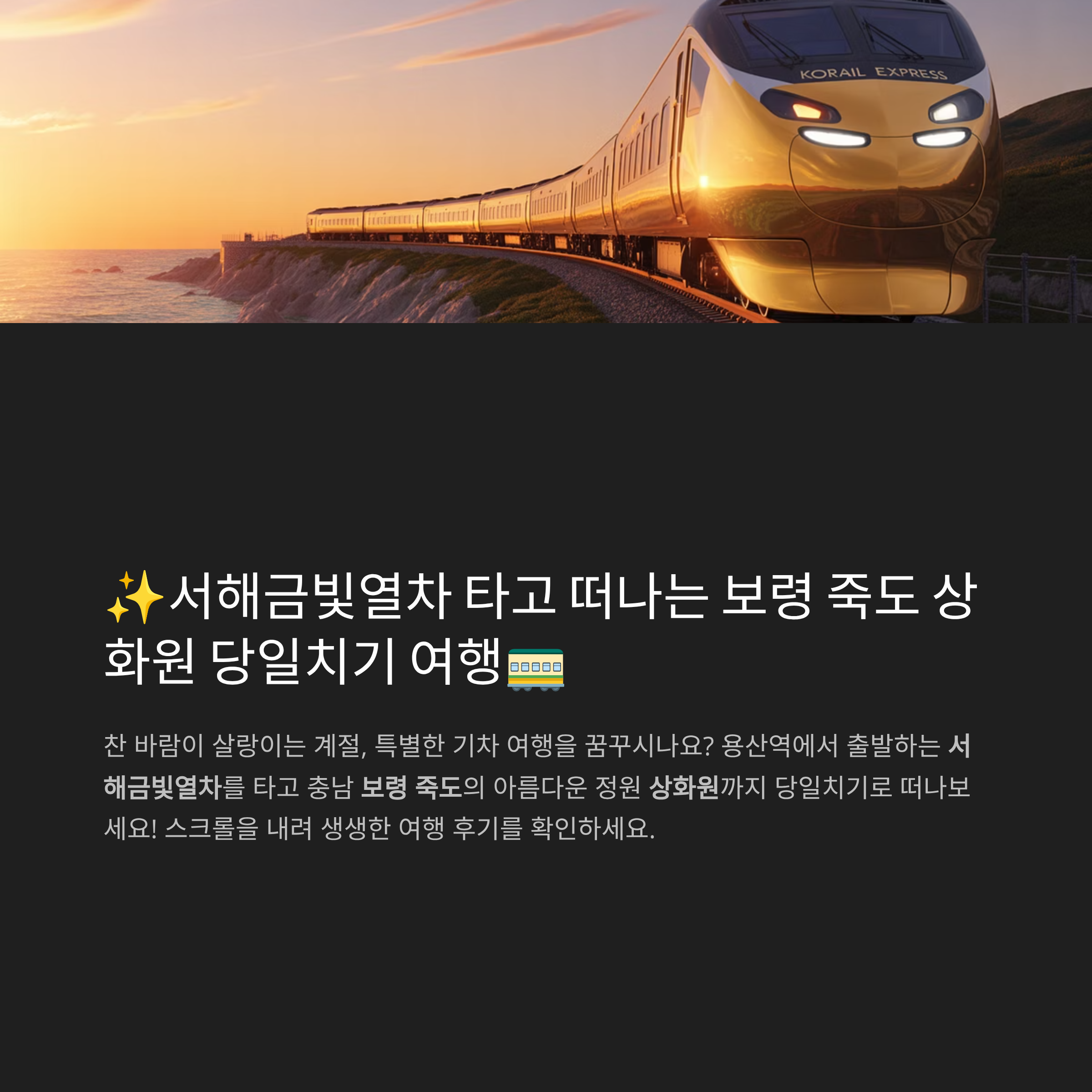 찬 바람이 살랑이는 계절, 특별한 기차 여행을 꿈꾸시나요? 🚂✨ 오늘은 용산역에서 출발하는 서해금빛열차를 타고충남 보령 죽도의 아름다운 정원 상화원까지 당일치기 여행을 다녀온 생생한 후기를 들려드릴게요!🚄 특별한 시작, 서해금빛열차 탑승!용산역은 호남선과 전라선 KTX의 기점이 되는 곳이죠!설레는 마음을 안고 서해금빛열차에 몸을 실었습니다.🤩 일반 열차와는 차원이 다른 매력을 가진 서해금빛열차,그중에서도 특별한 경험을 선사하는 온돌마루실을 이용했는데요.✅ 온돌마루실:최대 6인까지 오붓하게 이용 가능한 공간!따뜻한 온돌에 앉아 편안하게 여행을 즐길 수 있어요.추가 요금 3만 원으로 특별한 추억을 만들 수 있답니다. (매주 수요일 ~ 일요일 운행)창밖 풍경을 감상하며 이야기를 나누다 보니 어느덧 대천역..