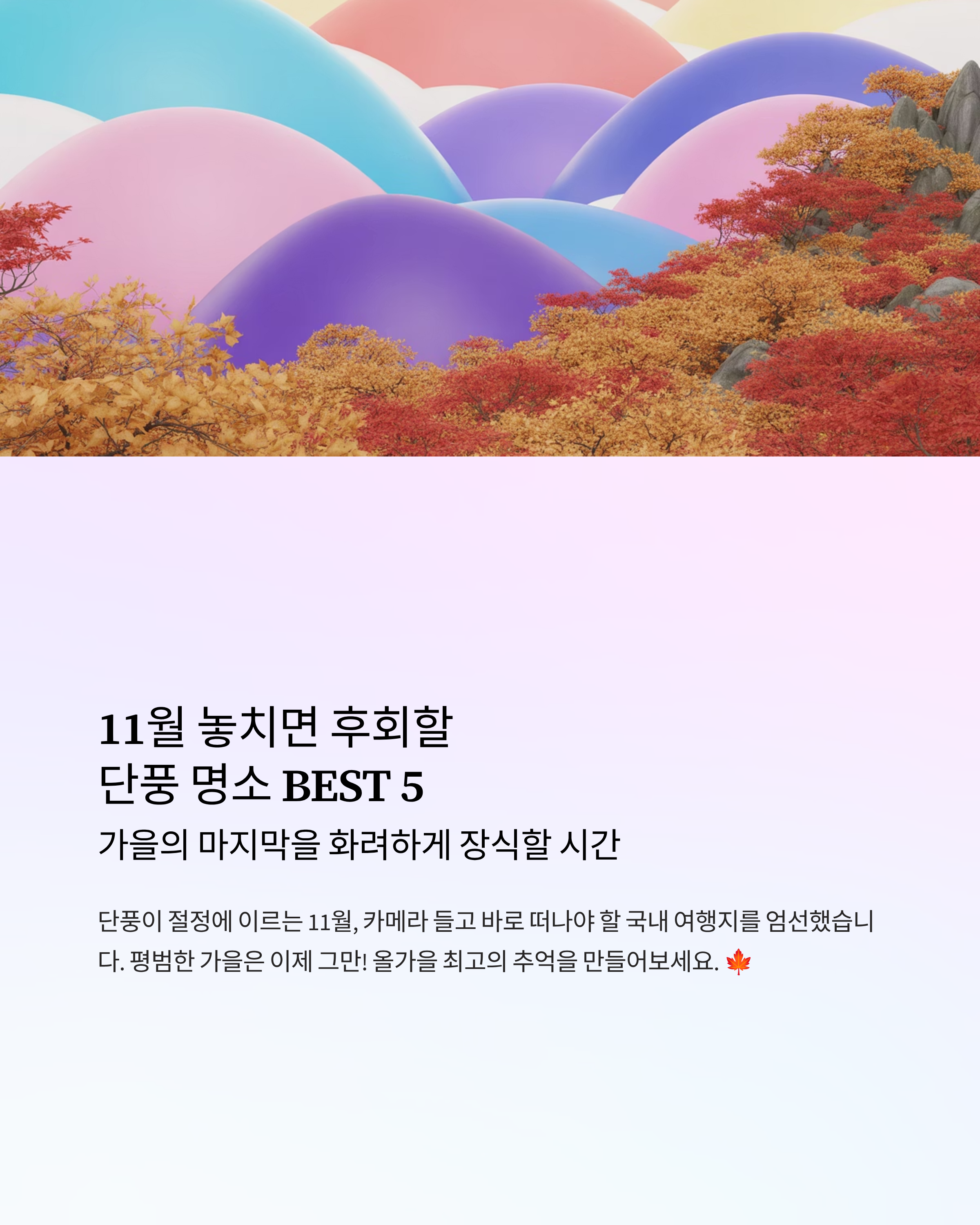 가을의 마지막을 화려하게 장식할 11월이 다가왔습니다.단풍이 절정에 이르는 이 시기, 카메라 들고 바로 떠나야 할 국내 여행지 5곳을 엄선했습니다.평범한 가을은 이제 그만! 올가을 최고의 추억을 만들어보세요.1. 충북 보은 | 말티재 & 속리산 자락 (드라이브 필수 코스) 🚗💨가을 매력: 속리산으로 이어지는 길목에 위치한 **'12굽이'**의 스릴 넘치는 고갯길! 울긋불긋한 단풍 사이를 가로지르는 드라이브 그 자체로 힐링입니다.인생샷 Tip: 높이 20m의 말티재 전망대에 올라보세요. 구불구불한 도로와 단풍이 어우러진 가을 산의 대장관이 눈 앞에 펼쳐집니다.주변 추천: 신라시대 사찰 법주사와 천연기념물인 정이품 소나무를 함께 둘러보는 코스를 추천합니다.2. 전남 담양 | 메타세콰이아길 & 죽녹원 (황..